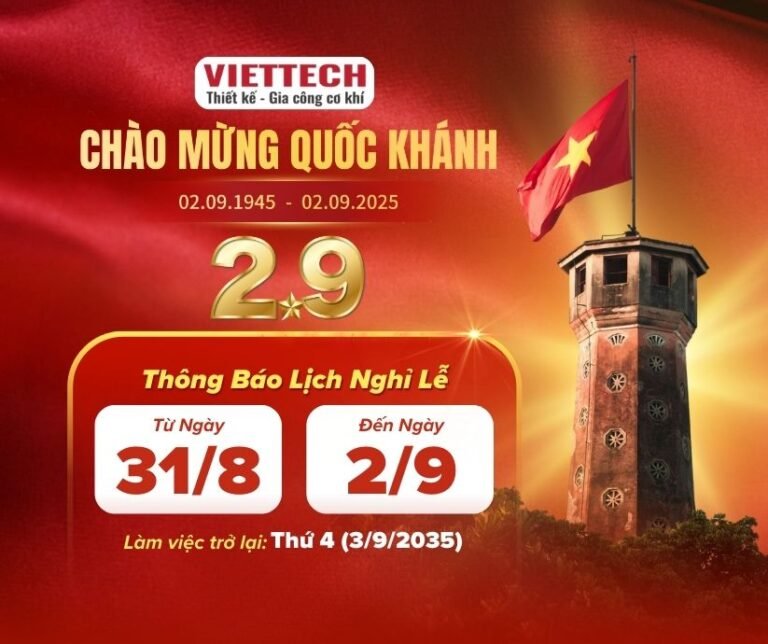 Công ty TNHH Thiết kế – Gia công Cơ khí VIETTECH xin trân trọng thông báo lịch nghỉ lễ Quốc khánh 2/9 năm 2025 như sau: